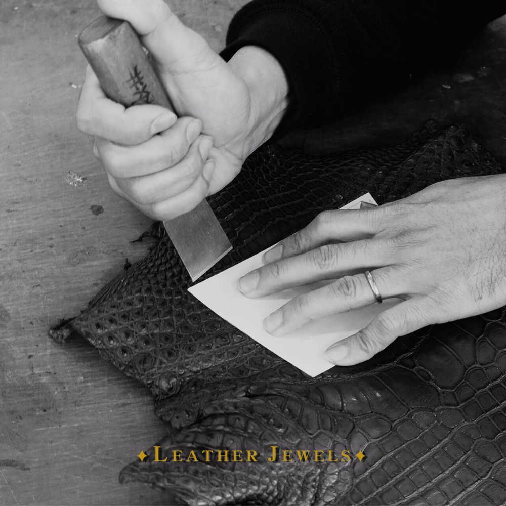 原皮はクロコダイルの中でも最高値で取引される「スモールクロコダイル(別名ポロサス)」の腑模様を贅沢にセンターカット。