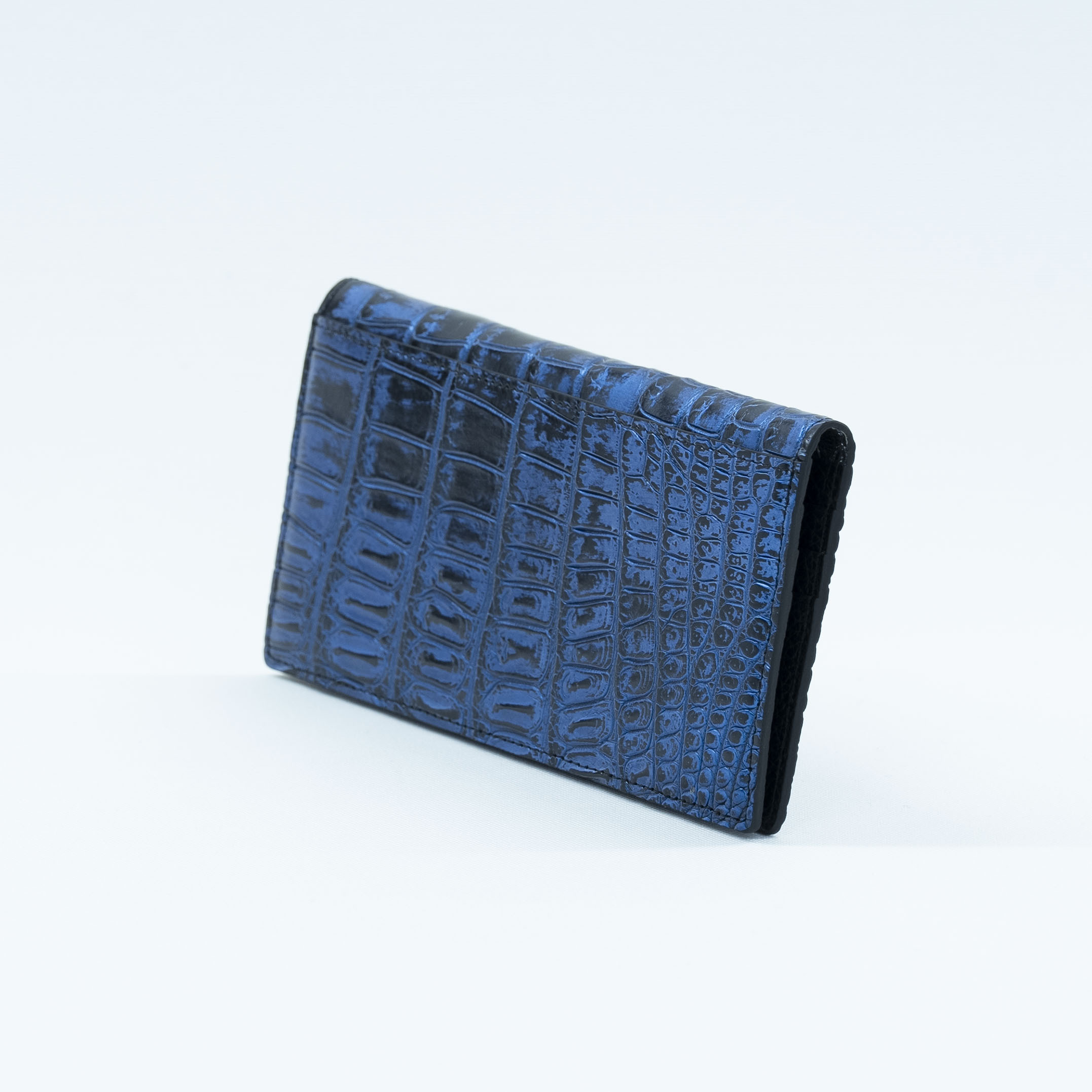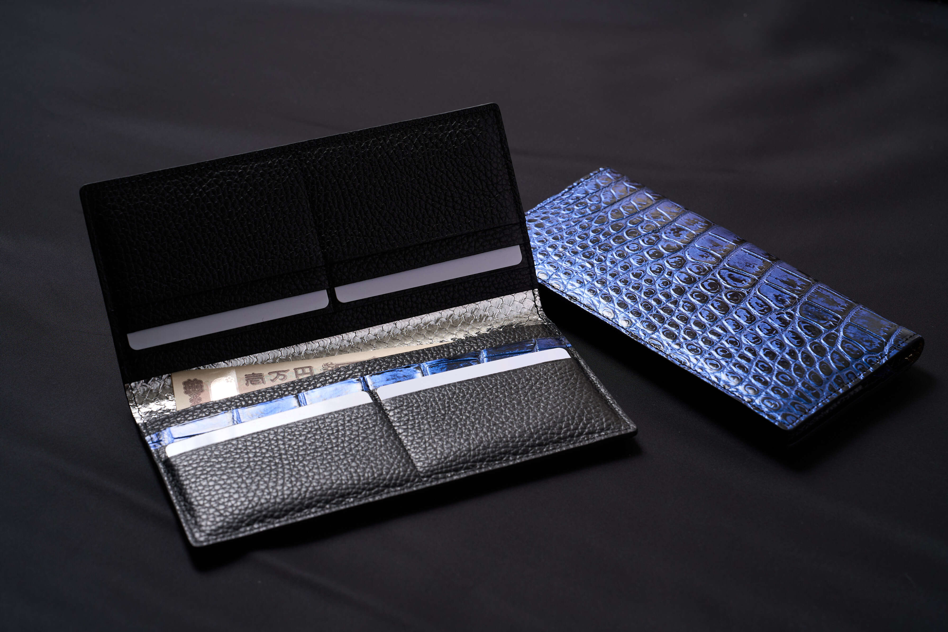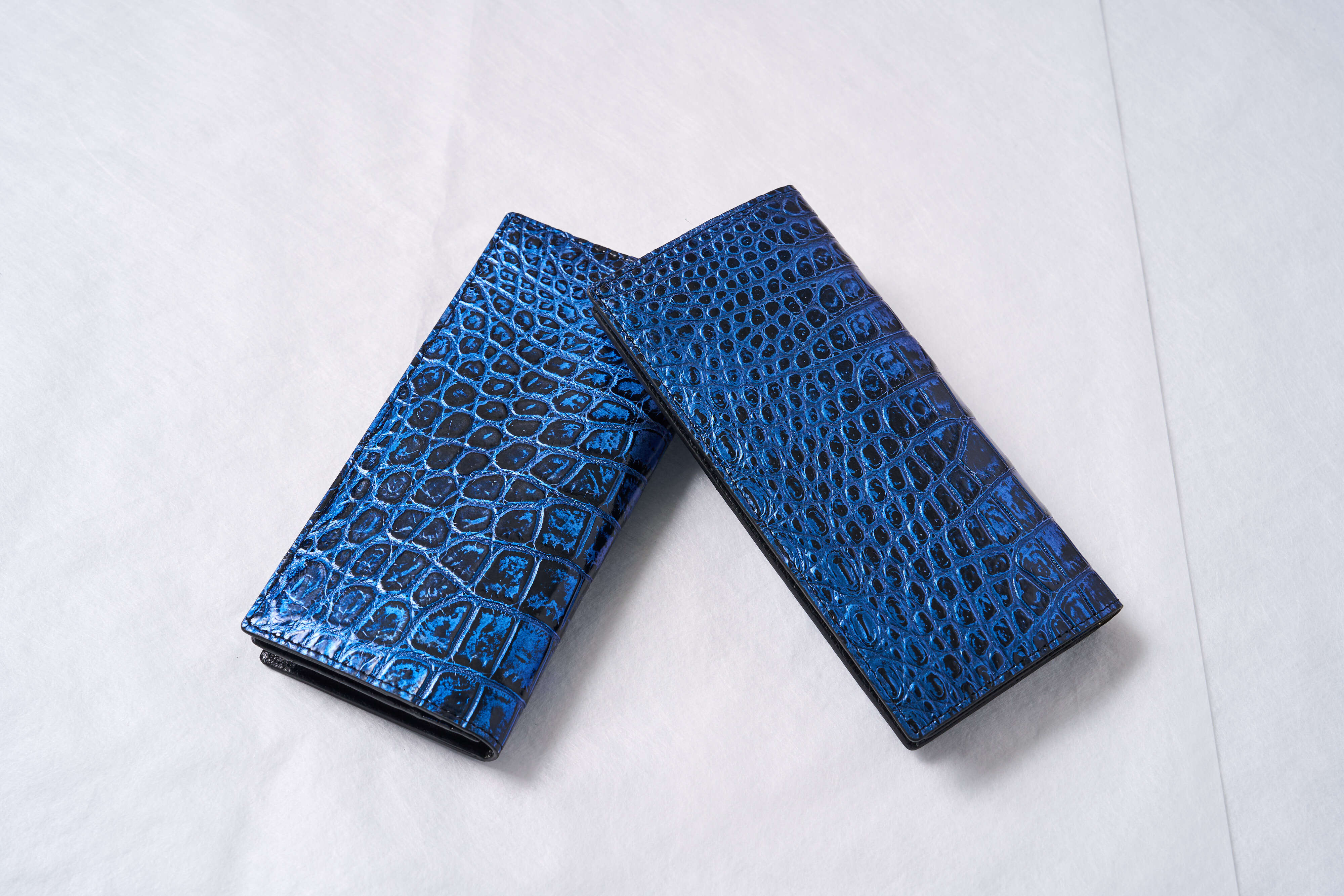 国内タンナーが一枚ずつ丁寧に染め上げたクロコダイルを使用した、日本製の薄マチ長財布。