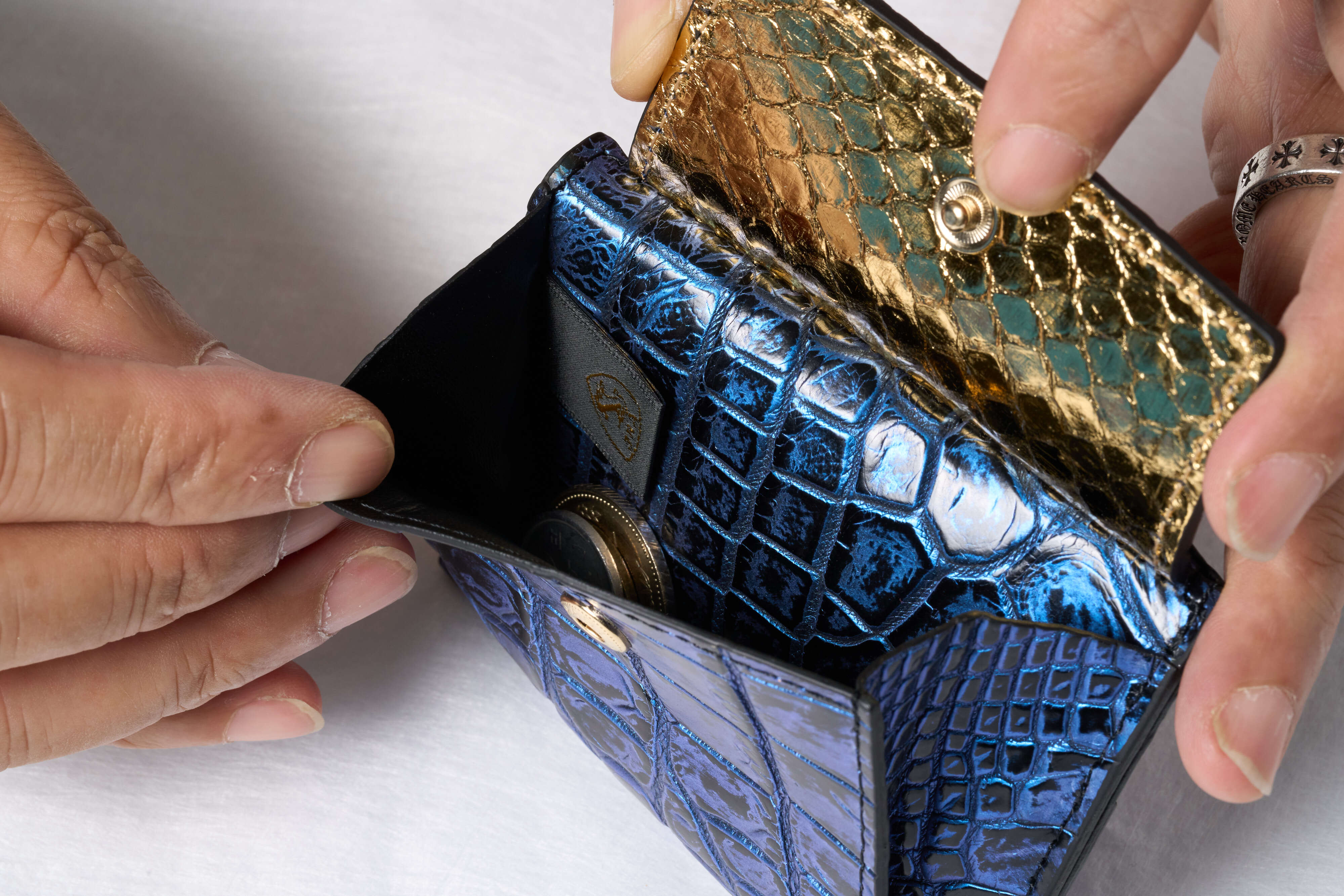 素材はクロコダイル革、イタリア牛革と一部パイソン革を使用。