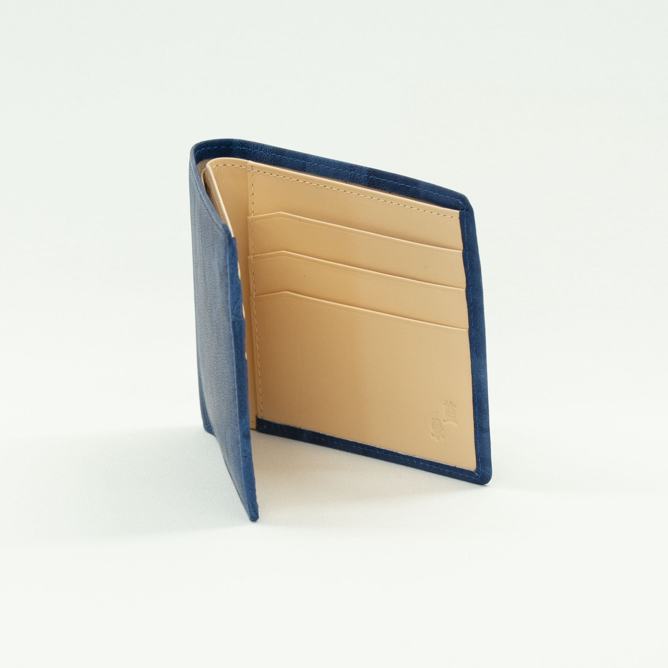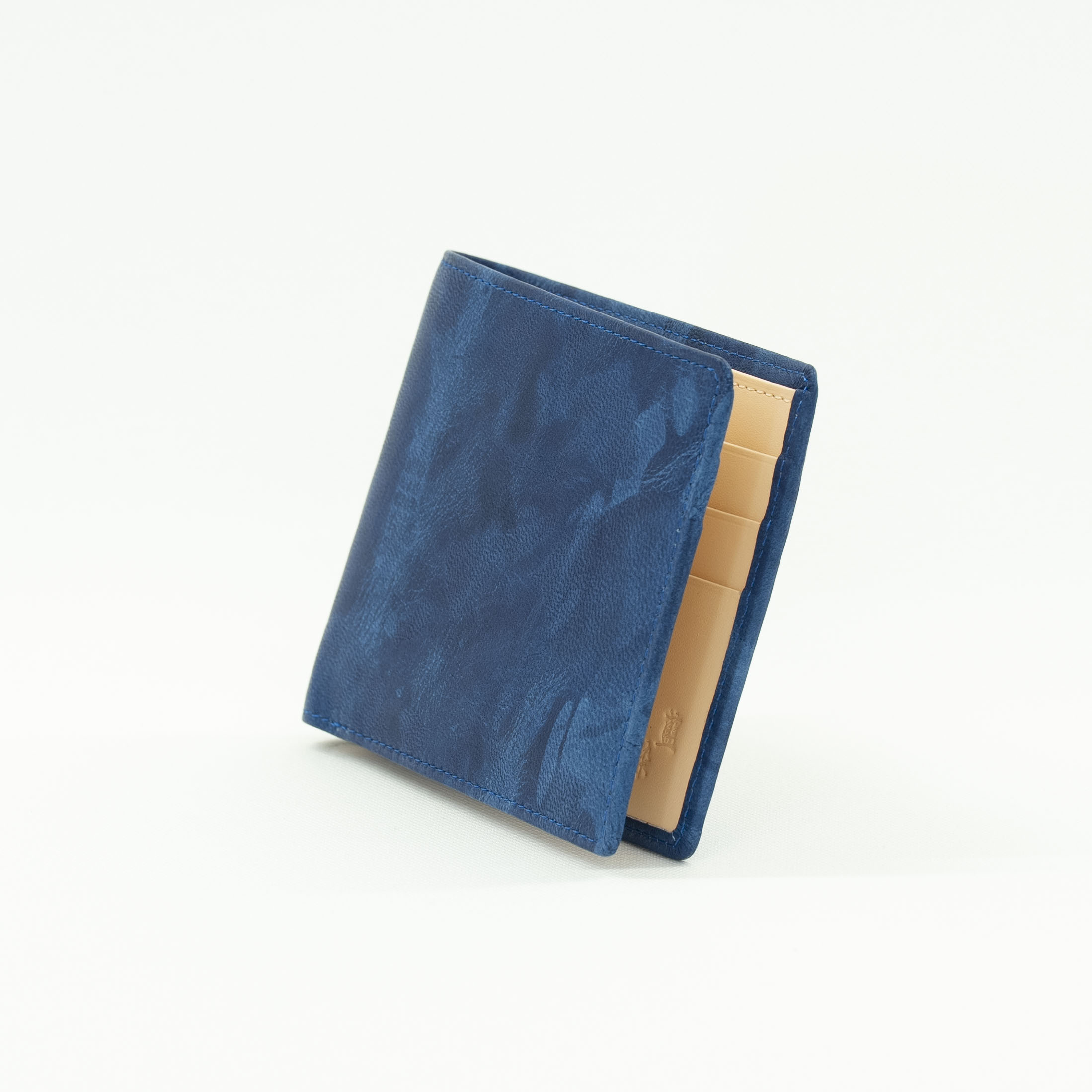 藍染とはタデ科の植物「藍(アイ)」を使った染物。柔らかいシープ革を使い、全て手作業で時間をかけ、手絞りと藍染の樽に漬ける作業を3度繰り返し、日本古来の上品な藍染『ジャパンブルー』が出来ました。手絞りなので模様と色合いはひとつひとつ異なります。小銭は別財布という方にお勧めの折財布で、その分カードを入れるスペースも多くシンプルで薄めな折財布となっています。