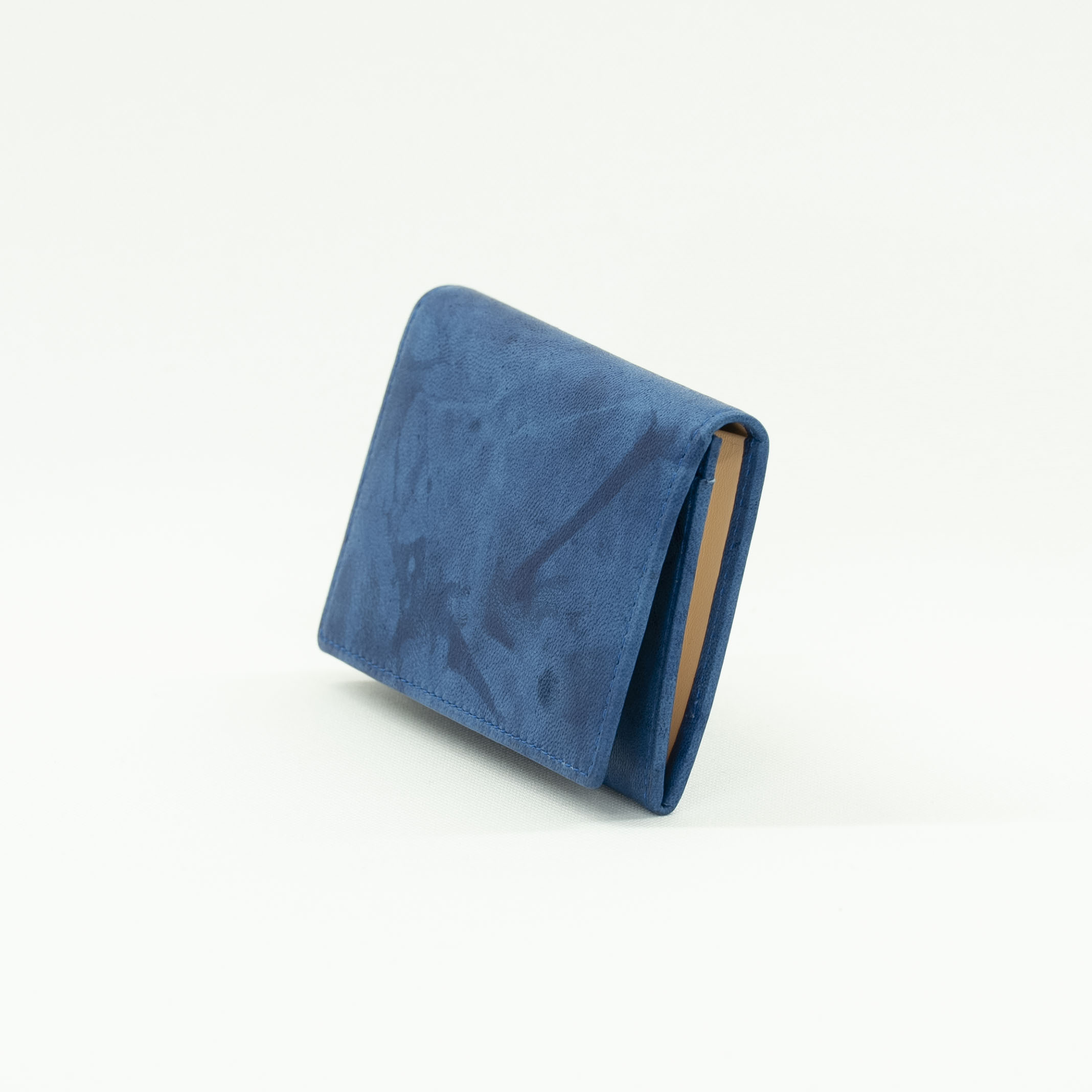 藍染とはタデ科の植物「藍(アイ)」を使った染物。柔らかいシープ革を使い、全て手作業で時間をかけ、手絞りと藍染の樽に漬ける作業を3度繰り返し、日本古来の上品な藍染『ジャパンブルー』が出来ました。手絞りなので模様と色合いはひとつひとつ異なります。